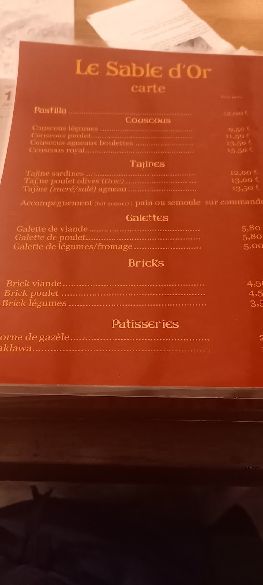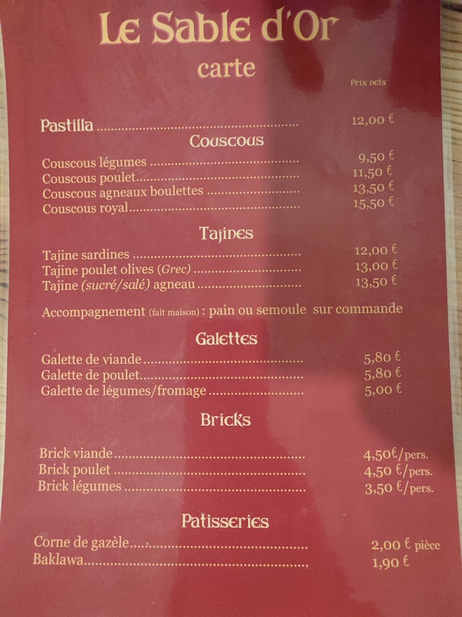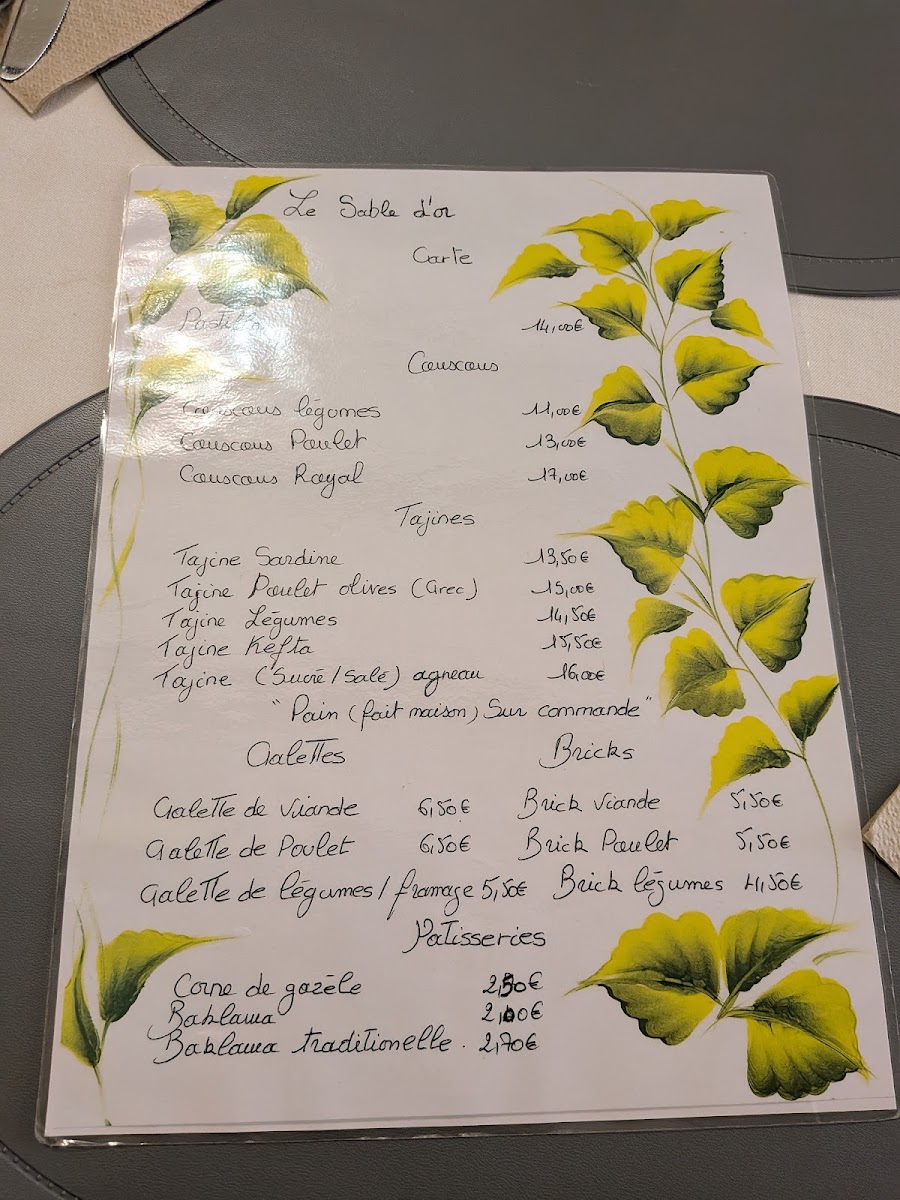 In summary, Le Sable D'or provides a well-rounded menu, with something for every taste, from the rich, savory dishes like the Couscous Royal to the lighter options such as the Gemüseintopf. The addition of the Pâtisserie Orientale ensures that the meal ends on a sweet note, leaving guests fully satisfied.