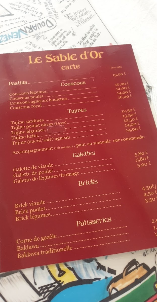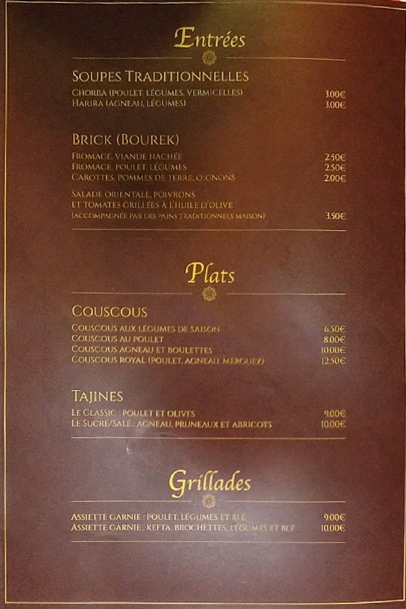 The menu at Le Sable D'or offers a delightful blend of flavors, showcasing a variety of traditional dishes with an exquisite touch. One of the standout dishes is the Couscous Royal, a rich and hearty option perfect for those who enjoy a combination of tender meats and flavorful couscous. The dish typically includes lamb, chicken, and a variety of vegetables, creating a satisfying meal for anyone craving comfort food with a Mediterranean flair.